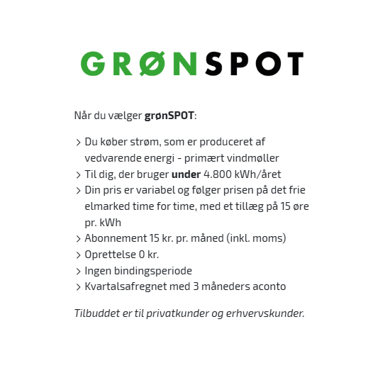 Modtager du din elregning fra Vestforsyning El A/S hvert kvartal, vil du på de to næstkommende regninger modtage en rabat på 525 kr. inkl. moms.
